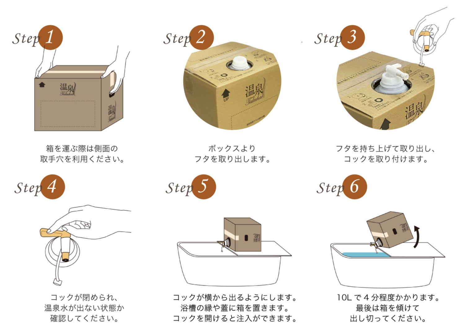 注文された温泉は注文が届いてから温泉地で汲みだされた温泉がバッグインボックス容器(1箱20リットル入り)で佐川急便がお届けします。