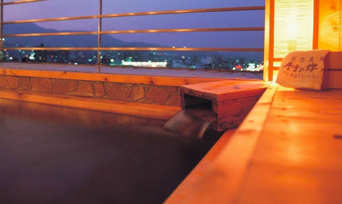 露天風呂から楽しむ別府の夜景。湯けむりの向こうにきらめく街並み。湯の街ならではの味わいが広がってます。